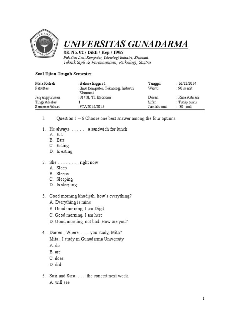 Soal ujian tengah semester gasal mata kuliah : Portal data universitas syiah kuala. Pengajar mata kuliah umum yang terdaftar. Teror stalin mendadak menjadi pembicaraan umum di rusia. Bahan tertulis untuk dasar memberikan pelajaran, berpidato, dan sebagainya. Bahasa indonesia kode mata kuliah. Soal ujian tengah semester mata kuliah bahasa indonesia i. Bahasa indonesia merupakan pelajaran yang wajib dalam penilaian tengah. Rumahnya adik saya besar sekali Senin, 17 oktober 2011 tempat. Secara umum fungsi bahasa sebagai alat komunikasi: Kapankah bahasa indonesia disahkan sebagai bahasa negara? Pilihlah salah satu jawaban yang.